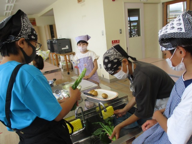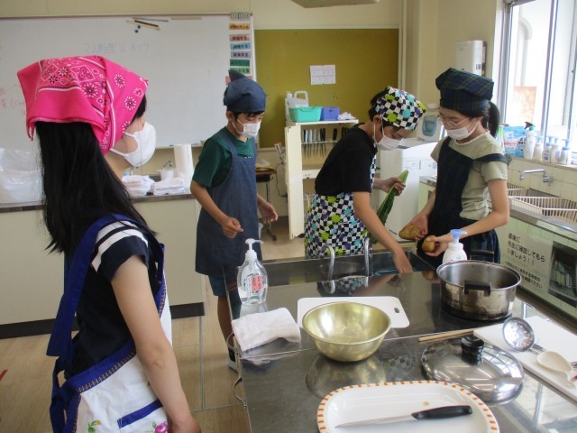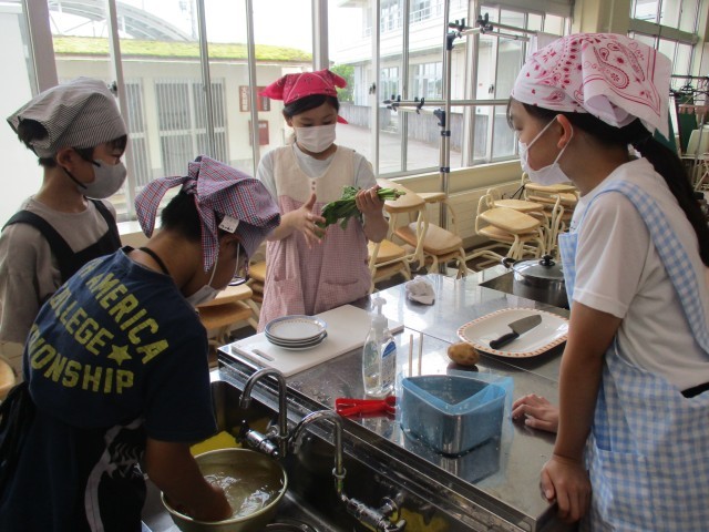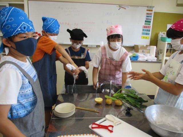 ゆで野菜の実習です。ジャガイモと青菜では、茹で方が違います。それぞれの茹で型に合わせておこないます。