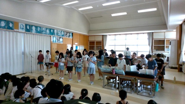 「ミッキーマウスマーチ」を合奏し、1年生や先生方に披露しました。1年生から「楽しかった」「上手だった」と言われ、嬉しそうでした。