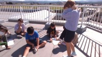 太陽とかげの向きの関係について、屋上に出て調べました。1時間おきにかげの...