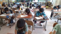 朝、登校すると自主的に発声練習を始めた子供たち。これまで、今日の学習発表会に向...