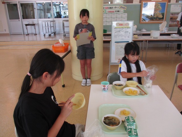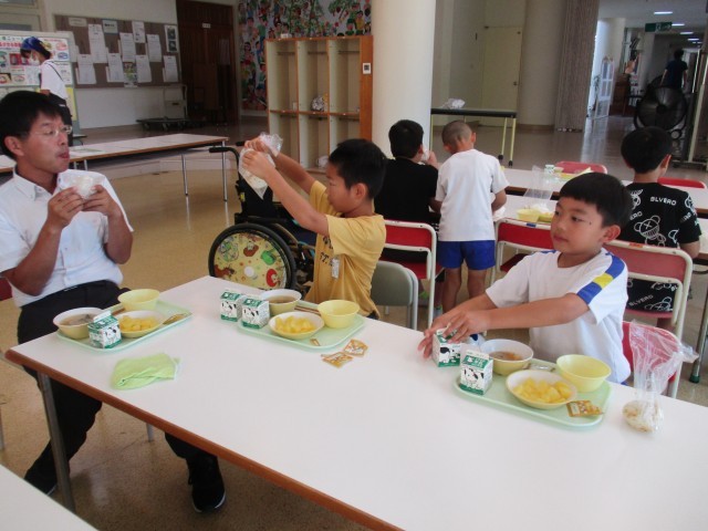 今日の給食は、9月1日の防災の日にあわせて、常温で保存可能な食品を使った献立や身近なものを食器の代わりにして食べる体験ができる「防災の日献立」でした。この機会に、家庭でも防災に対する意識を高めて、災害が起きた時の備えについて子供たちと一緒に話をしてみてください。