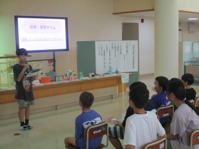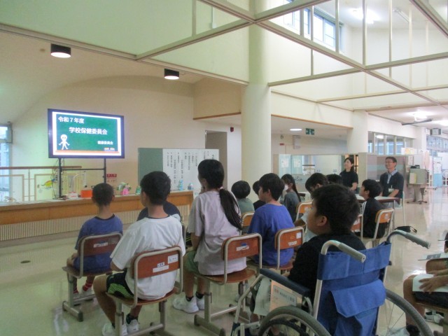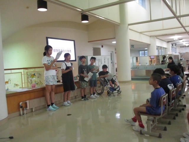 今年度は、「よい姿勢で健康に!~合言葉はグー・ペタ・ピン~」をテーマに、健康委員会の子供たちが発表をしました。そして、今日から25日まで「姿勢ピン!ポーズ」チャレンジ週間を行います。ぜひ、保護者の皆様も子供たちと一緒にお家で「姿勢ピン!ポーズ」にチャレンジしてみてください。