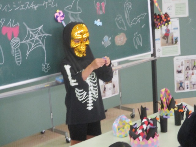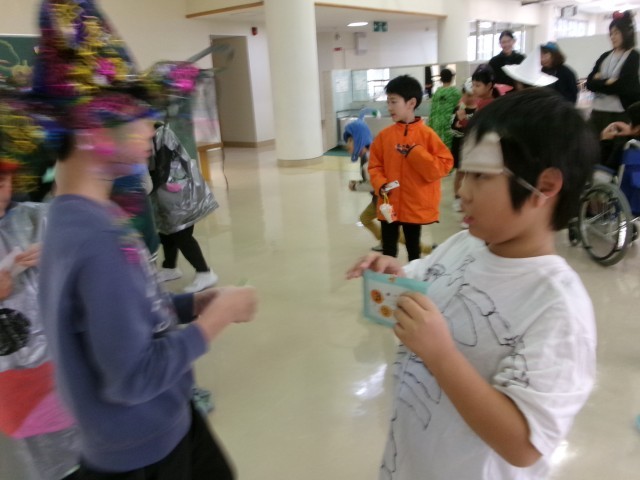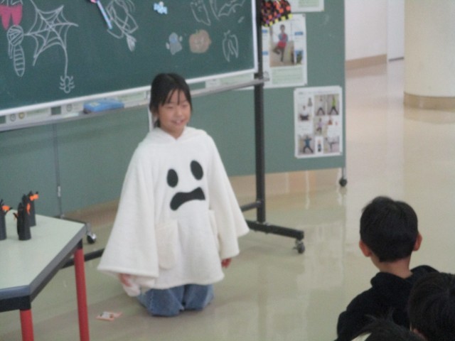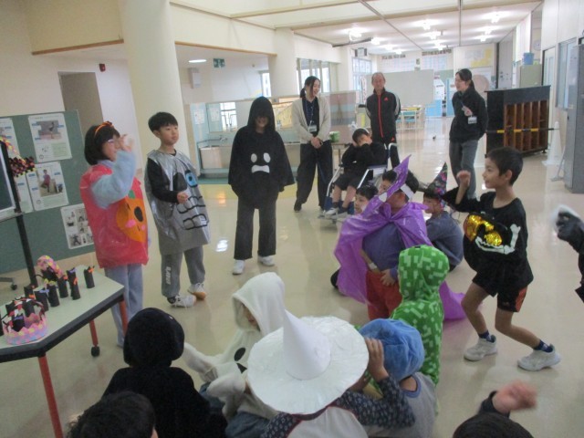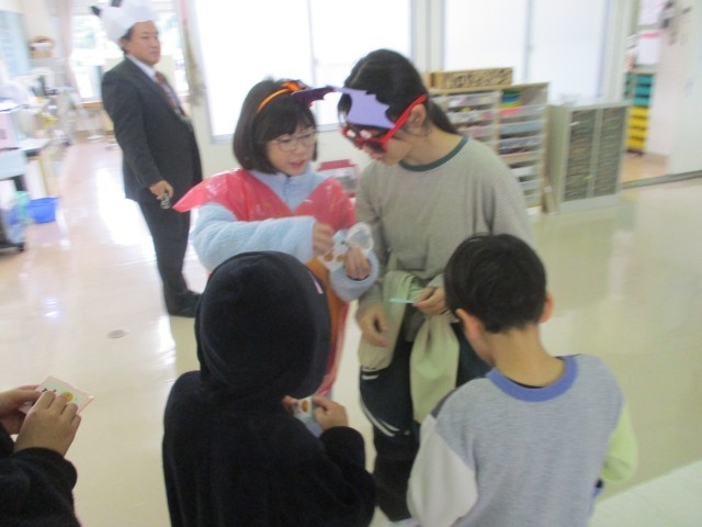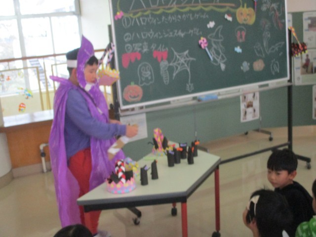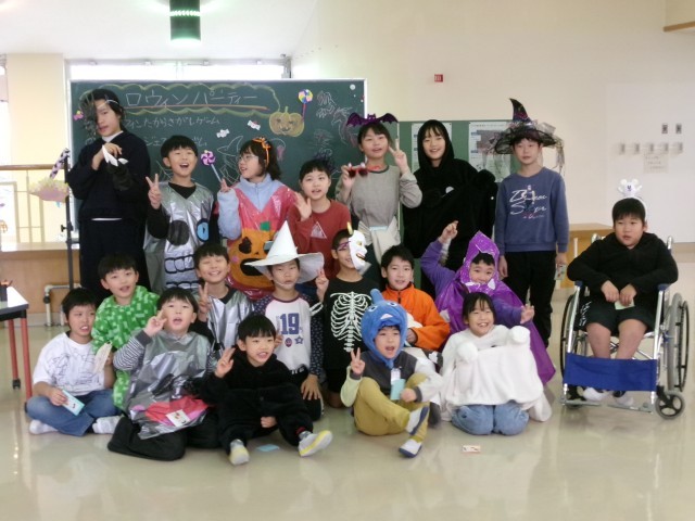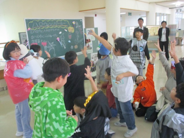 みんなで仮装してゲームをしたり、上学年手作りのハロウィンシールをもらったりして、とても楽しい集会になりました。