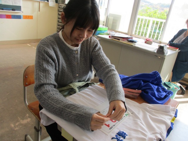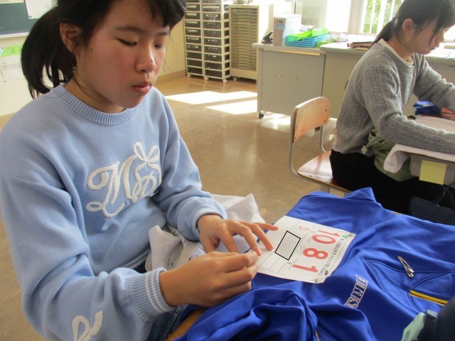6年生は、11月10日(月)のチャレンジ陸上記録会に向けて、体操服にゼッケンをつけました。