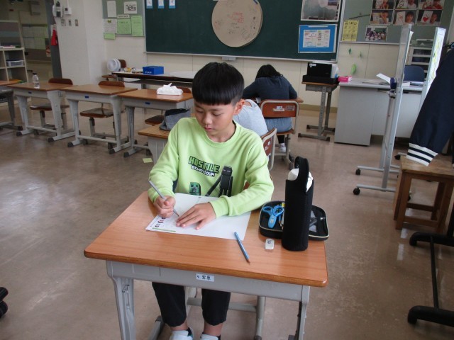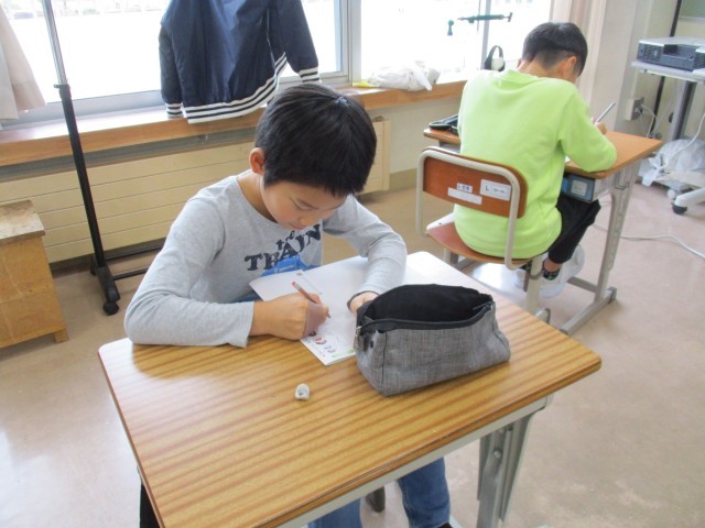 4年生は、国語の「聞く」テストに挑戦しました。音声を集中して聞き取り、真剣にメモをとっていました。