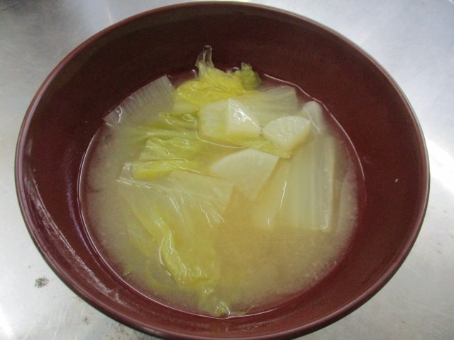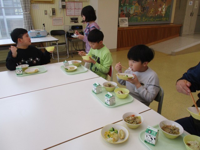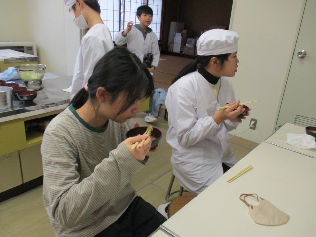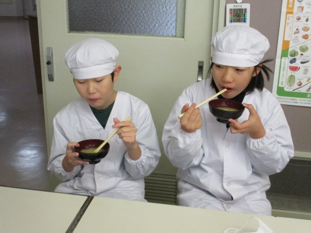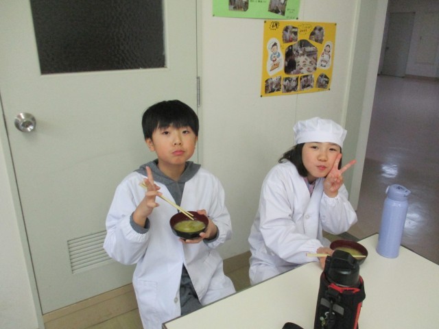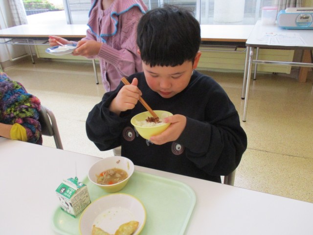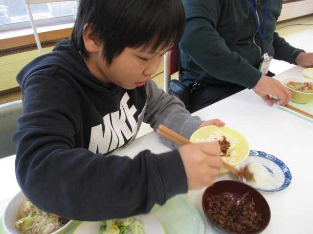 お味噌汁の具には、総合的な学習の時間に福沢の畑で育てた「大根」も入れました。また、食品ロスについても学習しているため、だしを取ったかつおぶしを使ってふりかけも作り、給食の時間に福沢っ子に振る舞っていました。