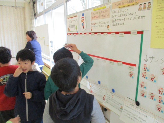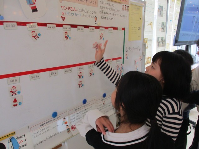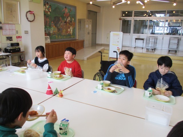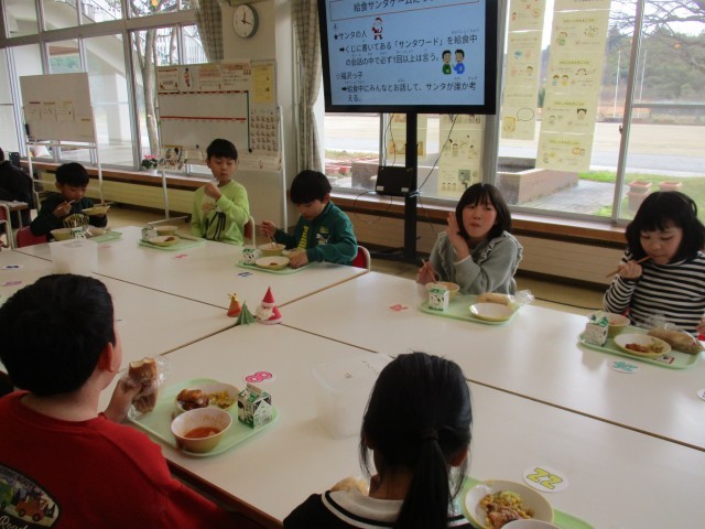 席替えや委員会児童が考えた「サンタゲーム」などを行い、楽しく給食を食べています。
