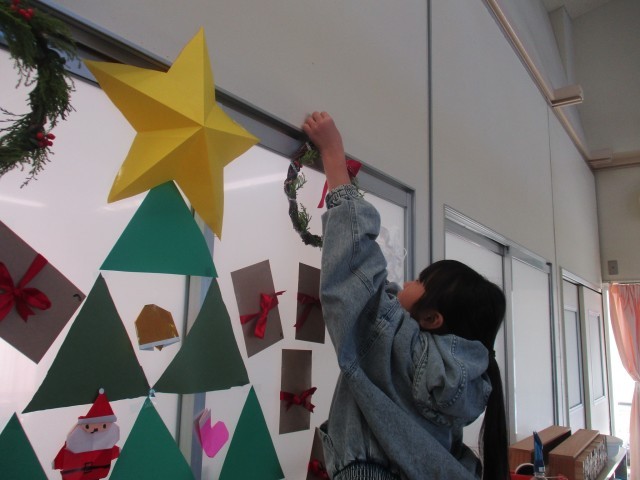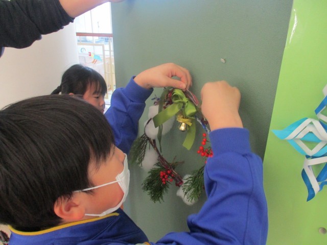 完成したリースは、中央ワークスペースのクリスマスツリーの横に飾りました。