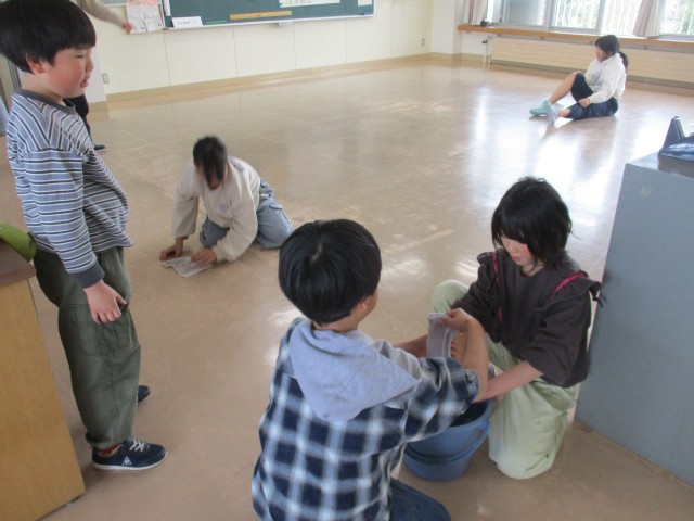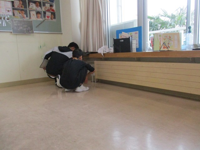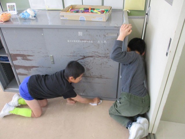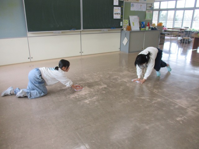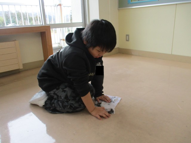ワックスがけのため、5時間目に子供たちみんなで協力して、教室にある机や棚などを廊下に移動させ、床をピカピカに磨いてくれました。