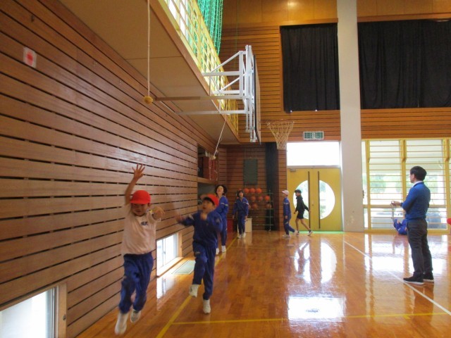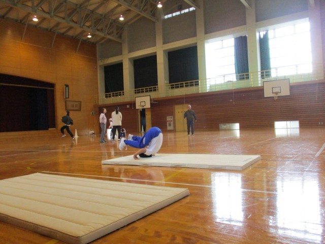 今日は雨だったので、体育館で早朝運動を行いました。
