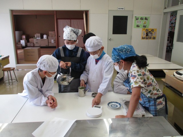 今日の家庭科では、お茶を淹れる学習をしました。茶葉やお湯をこぼさないように、慎重にお茶碗に淹れていました。