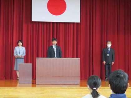 着任式では、子供たちは、新しく来られた先生方の話を真剣に聞いていました。福沢っ子を代表して6年の児童が歓迎の言葉を述べました。