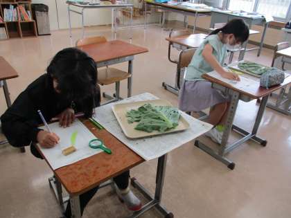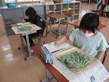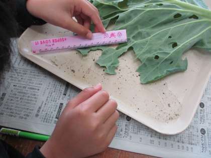 3年生の理科でモンシロチョウの幼虫を観察しました。色や形、大きさを虫めがねを使ってよく見ると、体に細かいトゲトゲがあり、足の本数まで数えることができました。