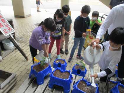 生活科で1年生はあさがおを、2年生は野菜を植えます。種を植えたり、苗を植えたり、土の準備をしたりしました。種と苗を植えた子供は、鉢の中に、水をたっぷりやっていました。