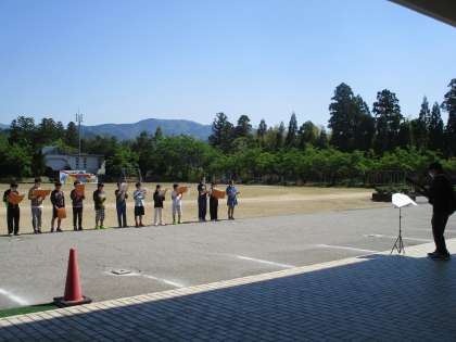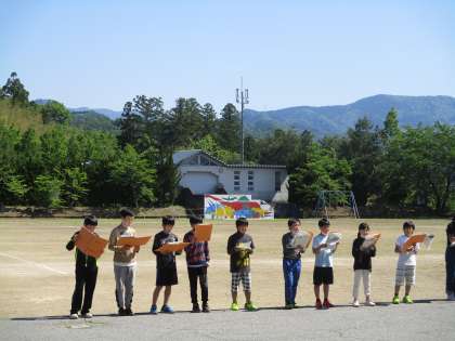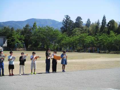 音楽の先生のギターに合わせて青空の下、歌を歌いました。とても気持ちよさそうでした。