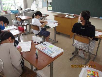 工作クラブでは、毎回、自分たちが取り組んでみたいことに挑戦しています。今回はグラスデコに取り組みました。乾くとガラス等に貼ることができ、ステンドグラスのようになります。