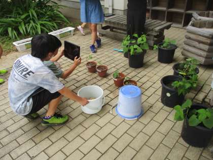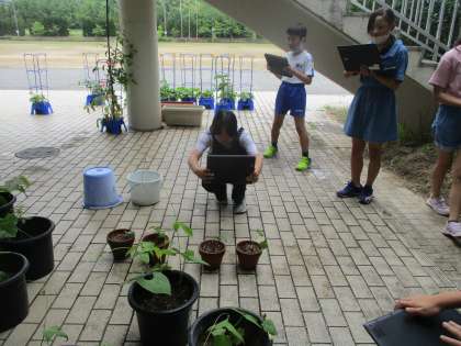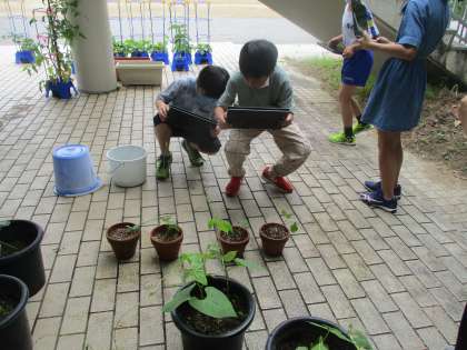 インゲン豆の成長の観察をしています。当番を決めて、クロムブックで写真を撮り、変化を見比べています。