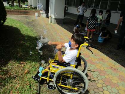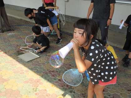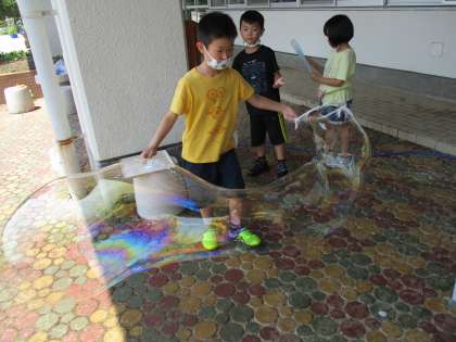 1・2年生の生活科の学習で、しゃぼん玉づくりをしました。いろいろな道具を使って、大きなしゃぼん玉づくりに挑戦しました。