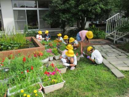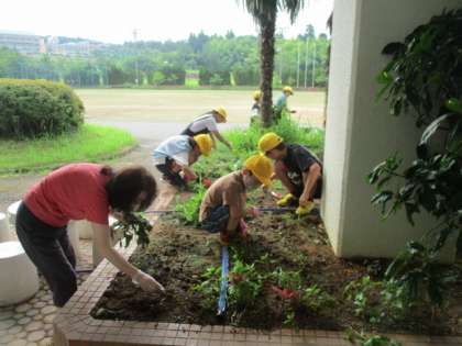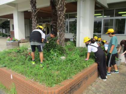 縦割り班で活動し、高学年を中心にみんなで力を合わせて草むしりや植え替えを行いました。