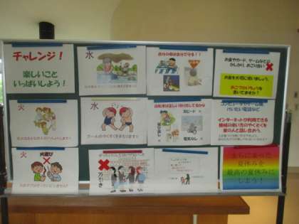 火の事故・水の事故・車の事故・人(不審者)に注意・お金(万引き)をしないの5つです。