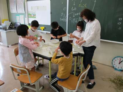 先日刈り取った稲穂の籾取りをしました。とても長い時間がかかりました。脱穀の大変さと農機具の便利さを実感した子供たちでした。