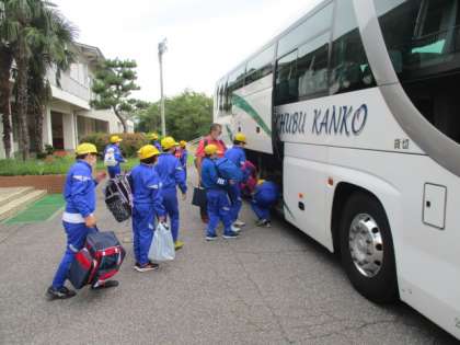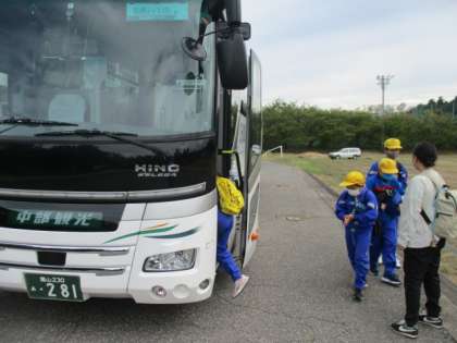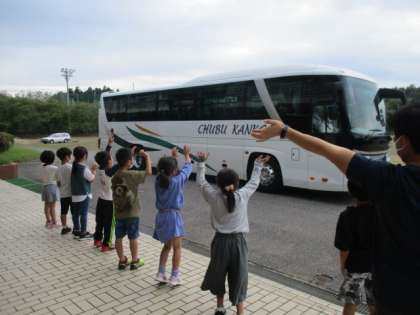 3〜6年が宿泊学習に出発しました。 1・2年生が見送りをしました。