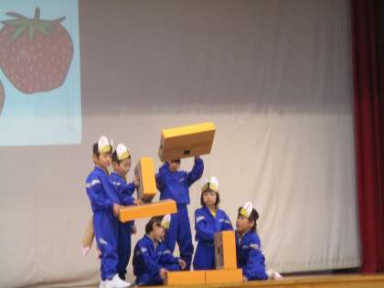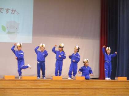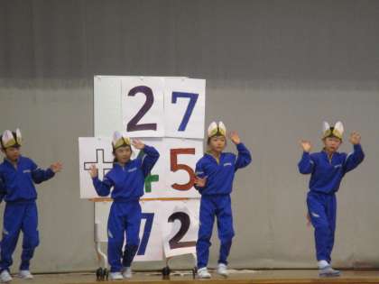 キツネに扮した子供たちが、算数科の数や計算、国語科のいろいろな数の学習を織り交ぜた発表をしました。