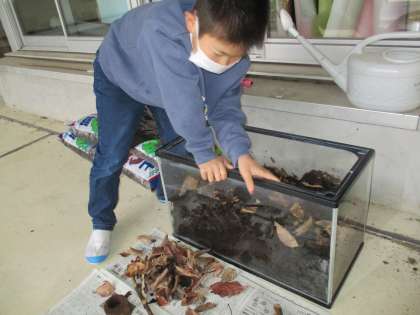 あおぞら1組ではカブトムシの幼虫のお世話をしています。42匹もいるので、毎日大変です。