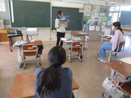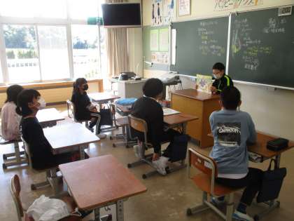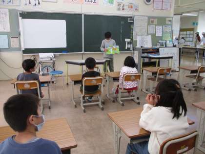 読書月間が始まっています。給食準備の時間に、委員会の子供たちが、各教室で紙芝居を読みました。