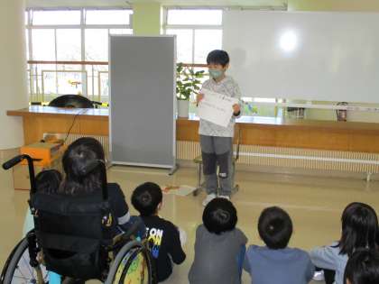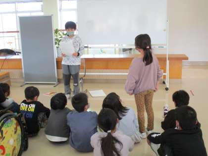 昼休みに、委員会の子供が、絵本の読み聞かせと、絵本についてのクイズの出題をしました。