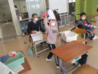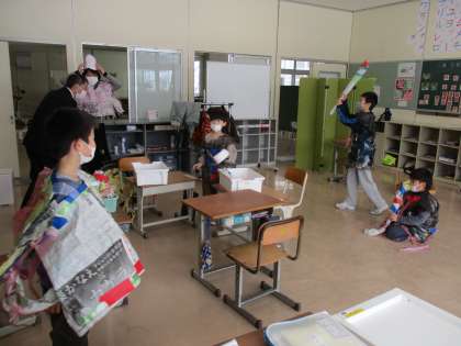 節分で鬼のお面や豆を作り、教室で豆まきをしました。