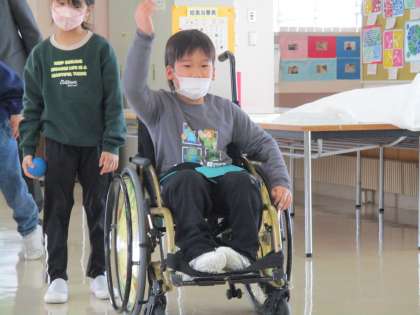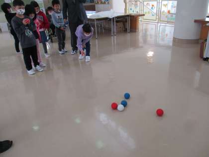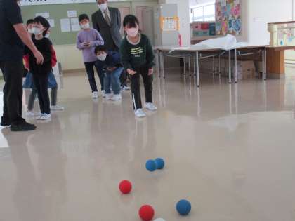1、2年生は初めてボッチャをしました。 的に近づけるのが難しかったものの、子供たちは楽しそうでした。