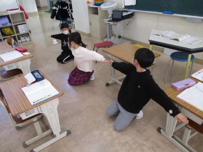 2年生は、手を広げた長さの「ひろ」を使って教室の幅の長さを測る学習をしました。