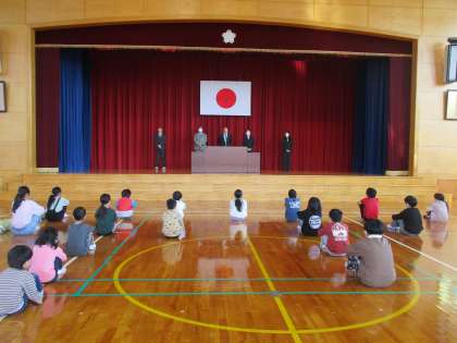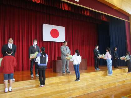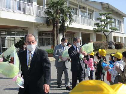 感謝の気持ちを込めて、代表の児童が花束を渡しました。