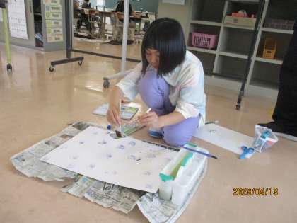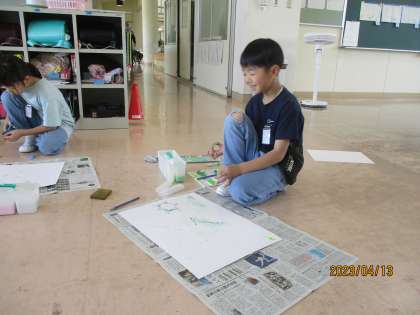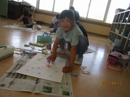 ダンボールやビー玉、ストロー、スポンジ等の用具を使って模様を描きました。色々な模様ができるのを楽しんでいました。