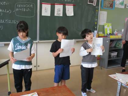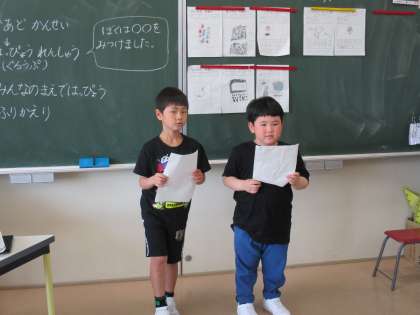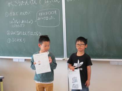 1・2年生は、昨日行った学校探検で分かったことをみんなの前で発表しました。