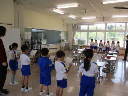 今日の朝は、1〜3年生で運動会の歌「ゴーゴーゴー」を練習しました。