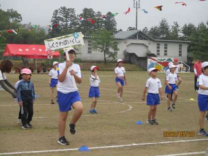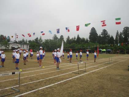 霧雨の中、運動会が行われました。子供たちの元気な歌声がグラウンドに響き渡りました。