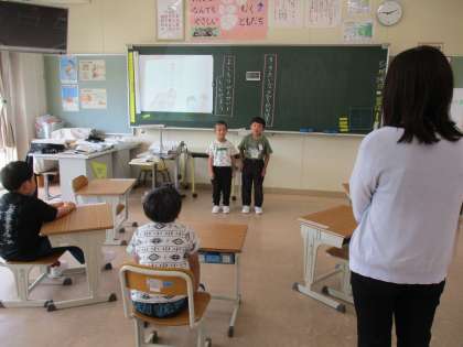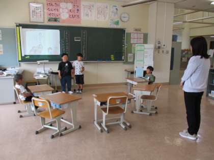 運動会の話を赤団と白団に分かれて、スクールサポーターの先生に伝えました。「勝ててうれしかったです。」「負けても全力でがんばって楽しかったです。」と話すことができました。