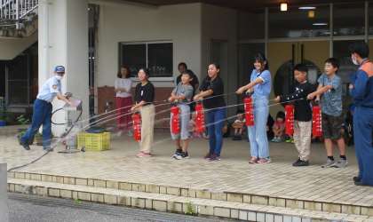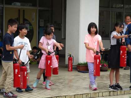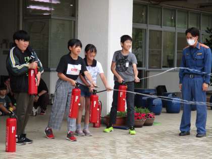 BFC入団式のあと、防火教室を行いました。消防士さんに消火器の使い方を教えてもらい、実際に火を消しました。