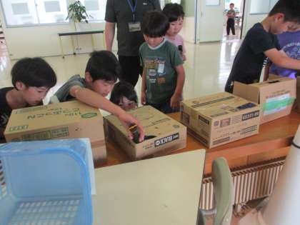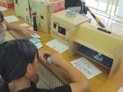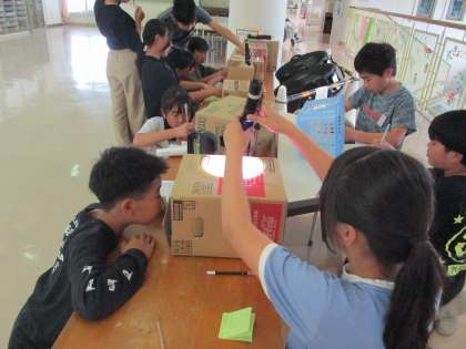鑑賞会では、友達の作品の良い所をたくさん見つけました。下学年には、光を当て箱の中が見えるようにして、説明しました。