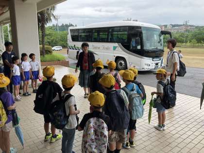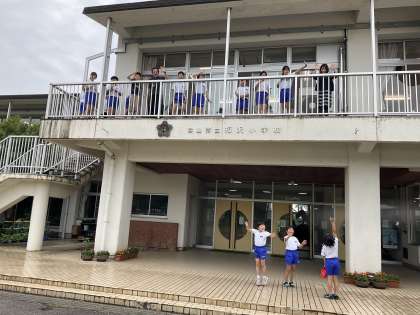 福沢小学校出発しました。 3〜6年生が見送ってくれました。