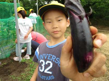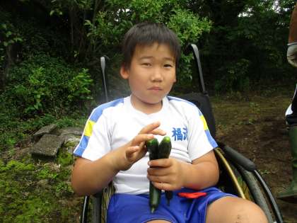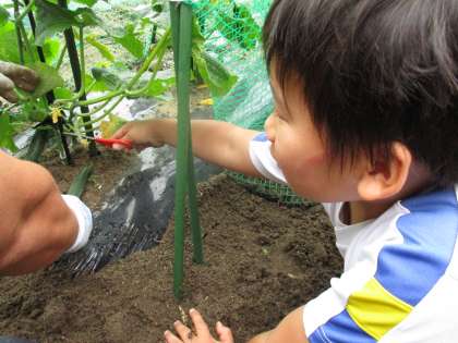 生活科で育てている野菜たちが、大きく育ってきました。 今日は、きゅうりとなすが収穫できました。