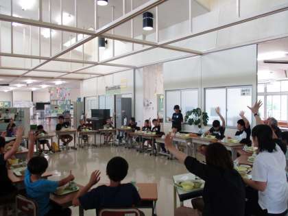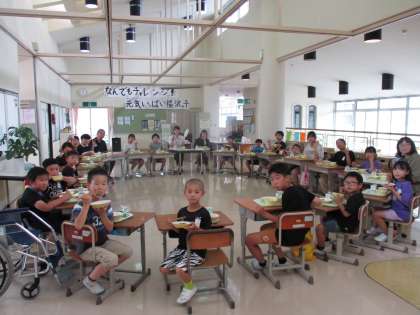 学校にいる1・2・5・6年生は、中央ワークスペースに集まって給食を食べました。