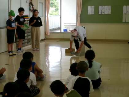 ハッピースマイル委員会の子供たちが、劇やクイズを通して、ほうきの正しい使い方や見つけ掃除の仕方を全校に伝えました。また、上学年がトイレ掃除の仕方を実際にやって見せて、下学年に教えました。