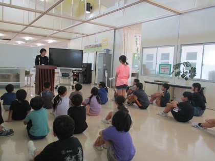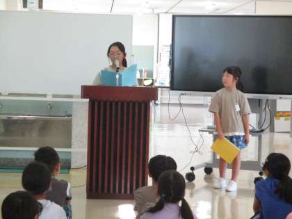 6年生と3年生代表が1学期を振り返り、できるようになったことや今後頑張りたいことを発表しました。