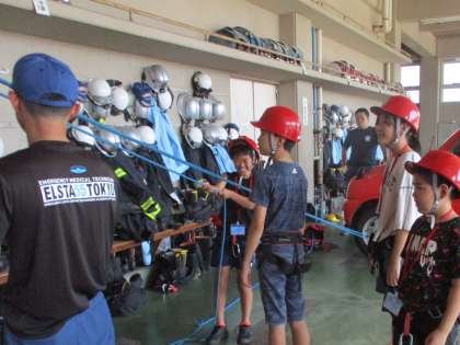 ロープ渡過体験でロープを渡ったり、山岳救助体験で重い物を工夫して持ち上げたりしました。