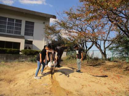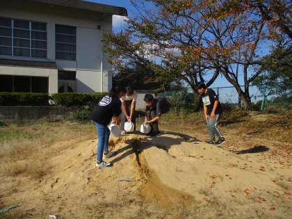 「流れる水のはたらき」について学習しました。じょうろ1本とじょうろ3本の水の量で違いがあるかなどを実験しました。