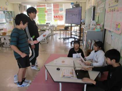 店員さんとお客さんに分かれて、食べ物を注文をしたり聞いたりしました。What would you like?の言い方に慣れて、楽しく活動しました。