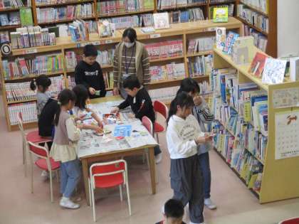 読書月間中の取組の一つとして、読書ビンゴを実施しました。読書をしてビンゴになると、メダルづくりやしおりづくりに参加できます。お気に入りの絵を切り取り、しおりづくりを楽しんでいました。